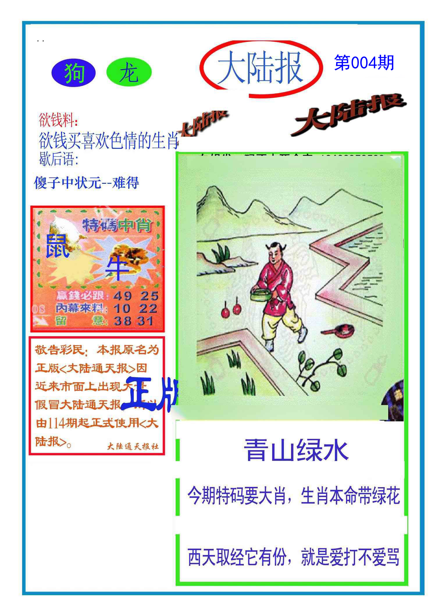 | 004期 | 虎 | 1尾尾 | 绿双 | 06-15 | 20狗 |