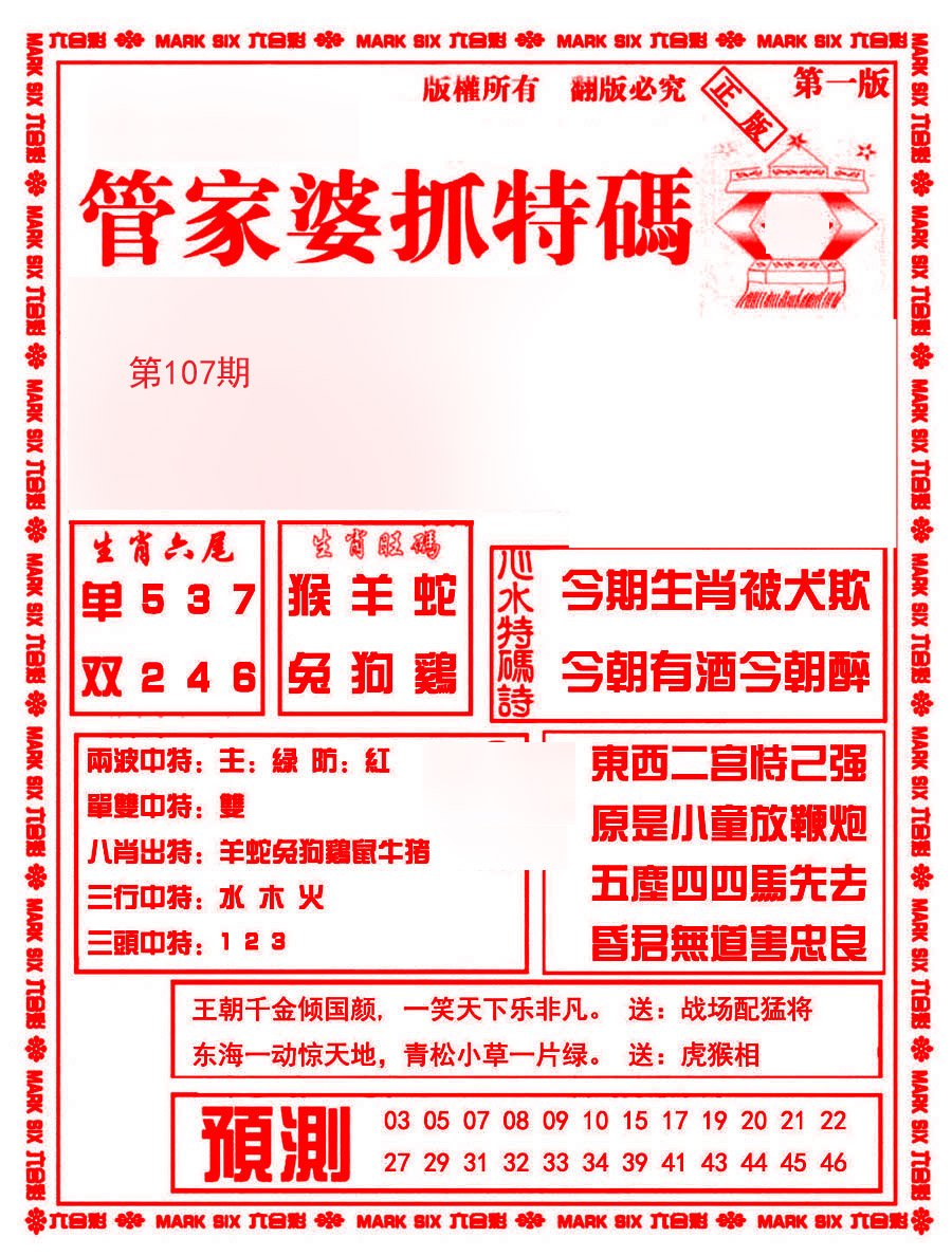 | 107期:公式一肖 | 107期:公式一波 | 107期:公式单双 |